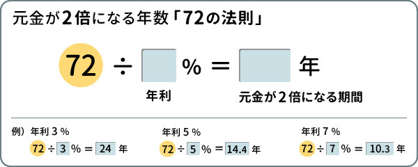 72 ÷ 金利(年利)= 資産が2倍になるまでの年数