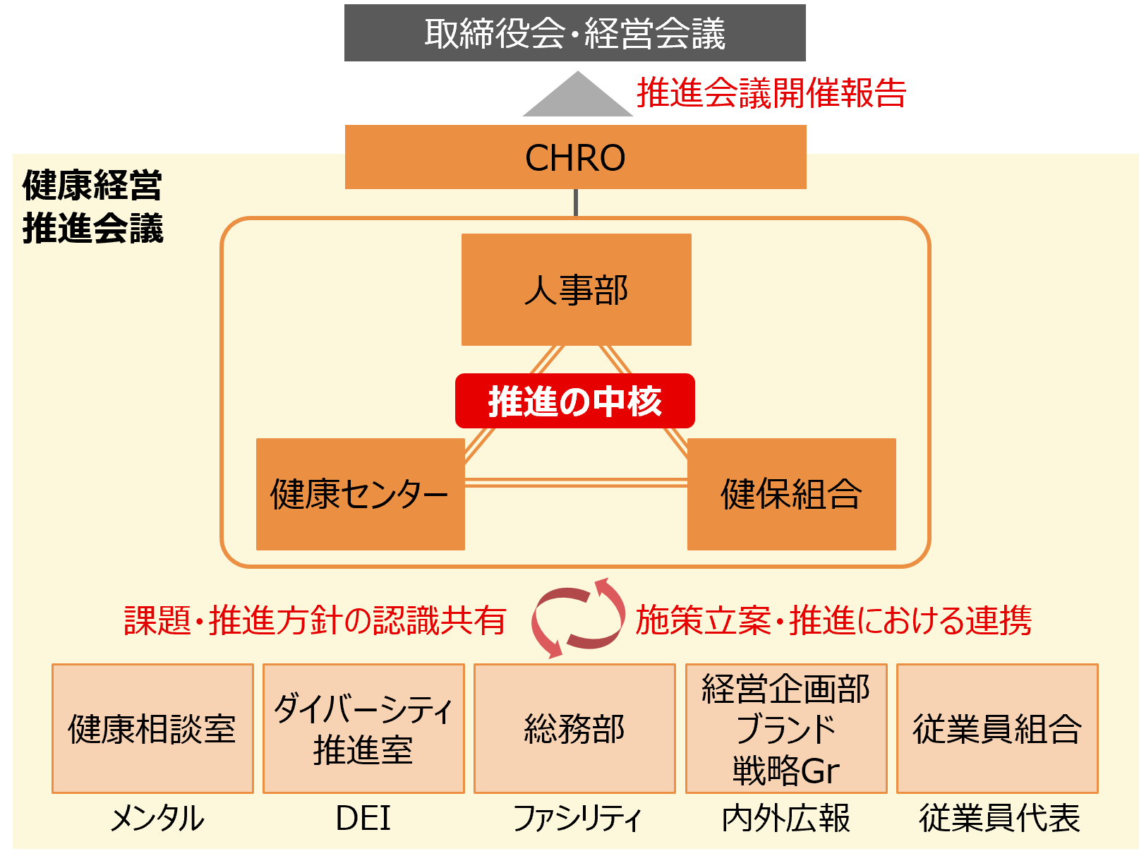 CHRO(Chief Human Resource Officer:最高人事責任者)を推進責任者とし、人事部が全体統括を行い、健康センターと一体となって推進します。また健康経営推進会議には、健康保険組合や従業員組合、ダイバーシティ推進室等の関連部門も参加し、DEI、人的資本開示、エンゲージメント向上等の関連施策と相互に連携します。