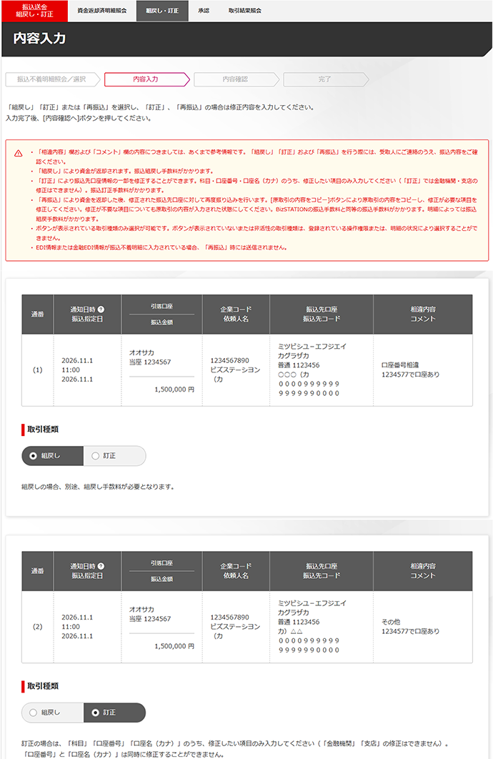 - 振込送金 組戻し・訂正サービスはBizSTATIONのお申し込み画面からBizSTATIONと同時にお申し込みできません。