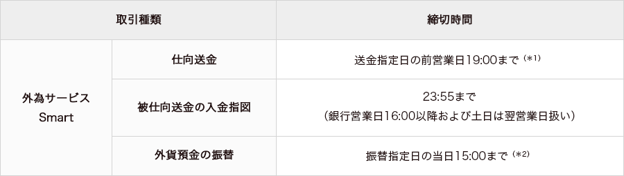 仕向送金 | 送金指定日の前営業日19:00まで(*1) |