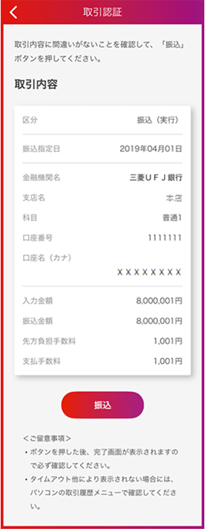 - アプリにて振込取引の実行・承認操作を行う際に、マルウェアや通信経路上で取引内容が改ざんされていないか確認いただくことで、不正利用等のリスクを軽減しています。