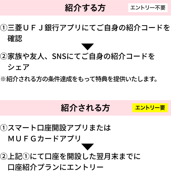 - 紹介される方が店頭窓口や店頭タブレット、対象外のアプリ(スマート口座開設アプリ・MUFGカードアプリ以外)で口座開設した場合