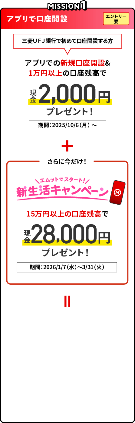 - 「口座開設プラン」および「エムットでスタート!新生活キャンペーン」へのエントリーをもって、株式会社三菱UFJ銀行が定める個人情報の取扱いに関する同意条項に同意したものとみなします。