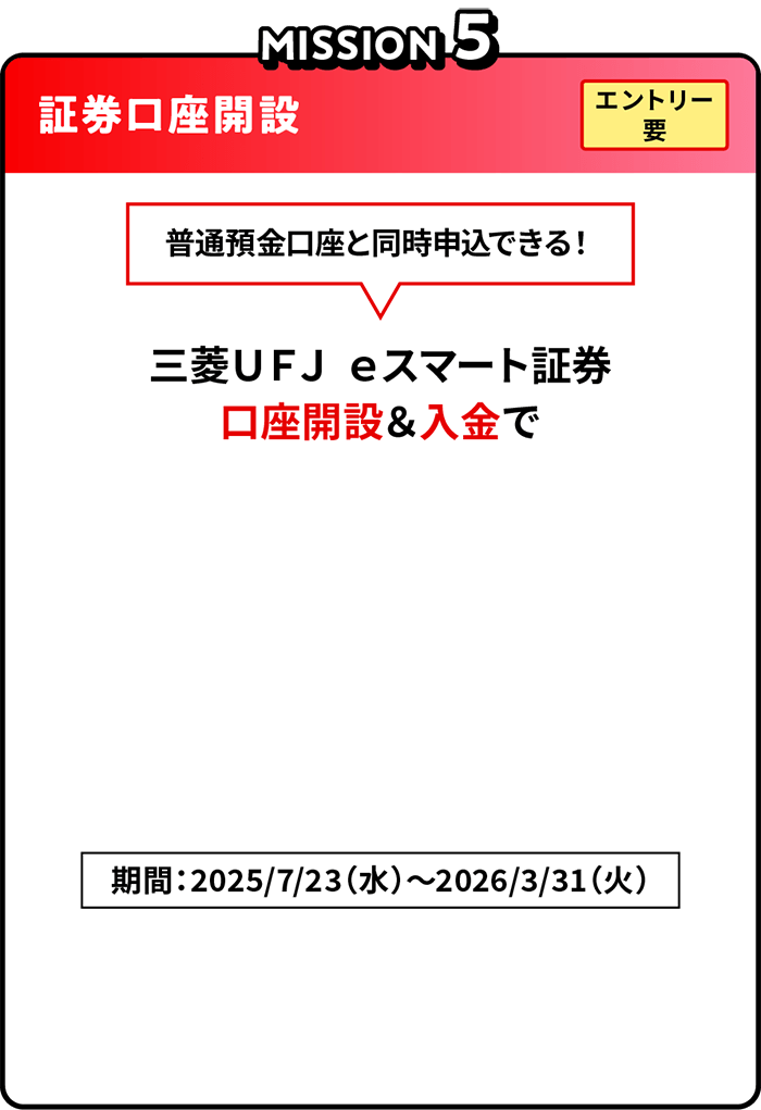 - 口座開設翌月末日の23時59分59秒までに完了する必要があります。エントリーフォームは口座開設プランと共通のため、本キャンペーン個別のエントリーは不要です。エントリーには三菱UFJダイレクトの登録が必要です。