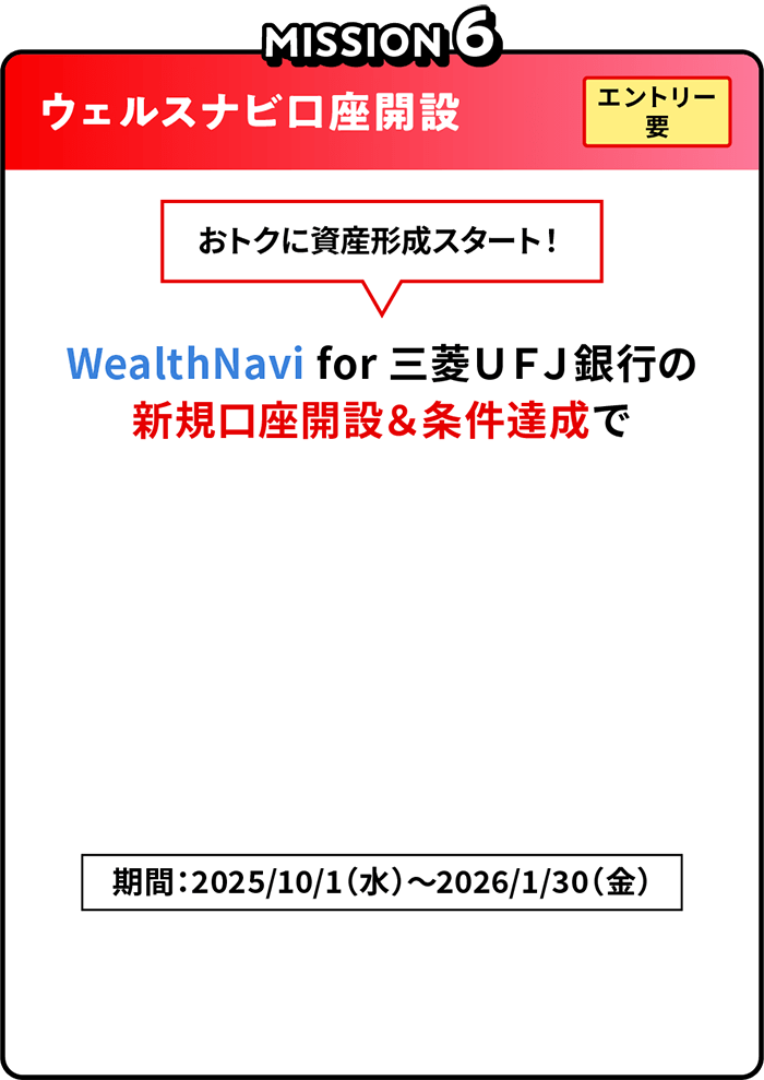 - 口座開設完了日の翌月末日の23時59分59秒までに完了する必要があります。エントリーには三菱UFJダイレクトの登録が必要です。