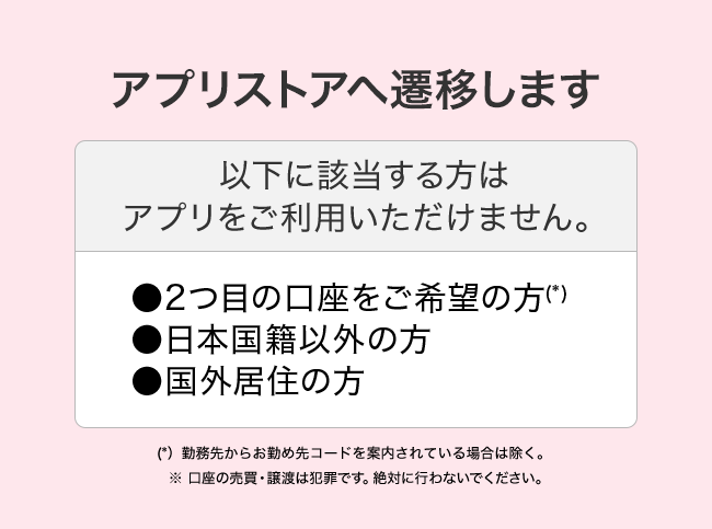 - アプリで口座開設のお申し込みを完了した場合であっても、口座開設をお断りする場合があります。あらかじめご了承ください。
