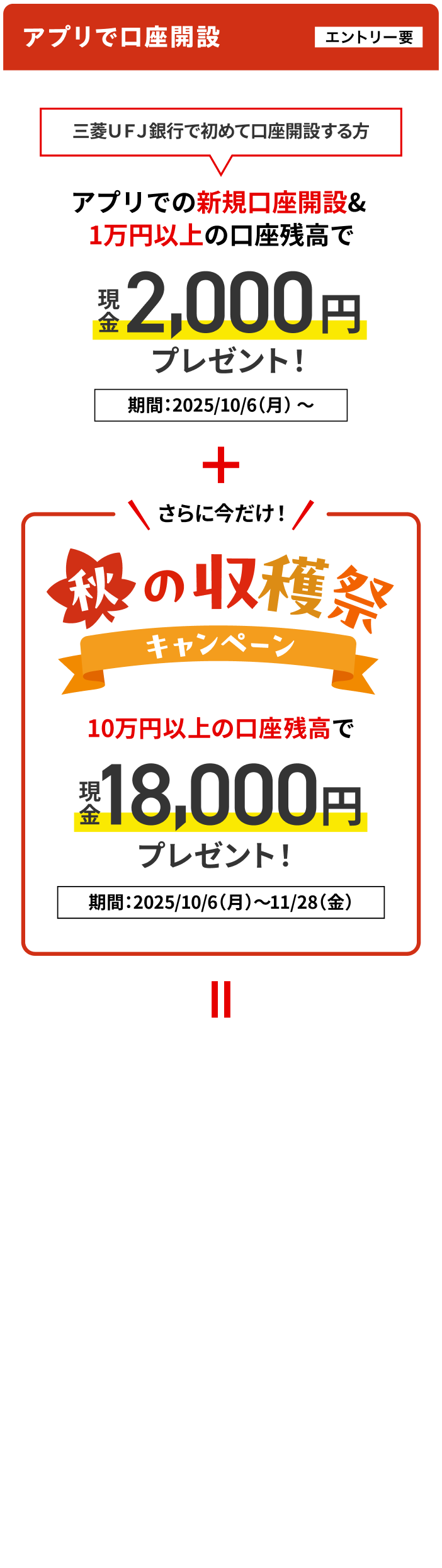 - エントリーの対象口座は、本キャンペーン実施期間中にスマート口座開設アプリ、もしくはMUFGカードアプリで開設された当行普通預金口座です。