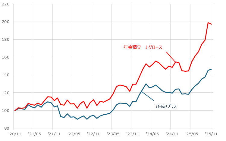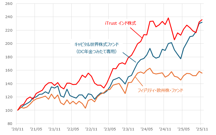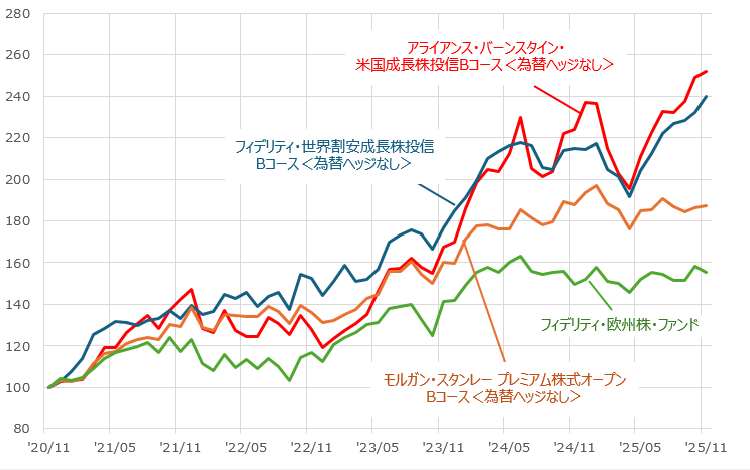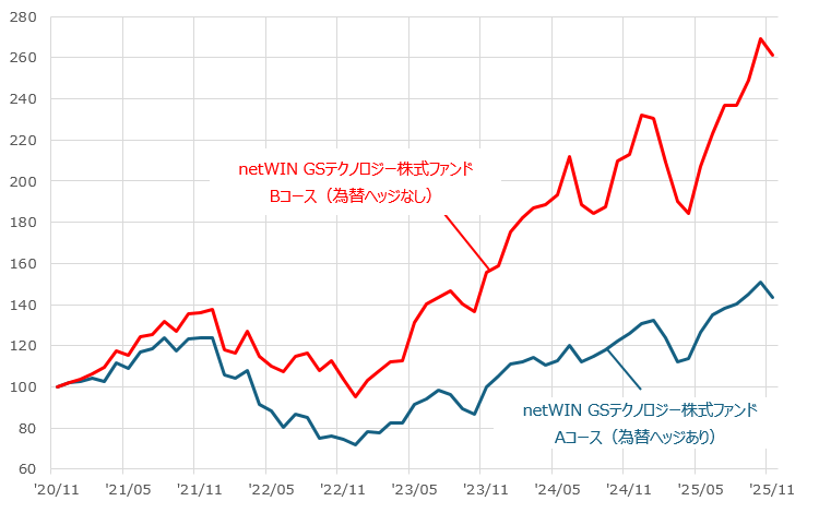 【為替ヘッジを行わないファンド】2020年11月末~2025年11月末(月次)
