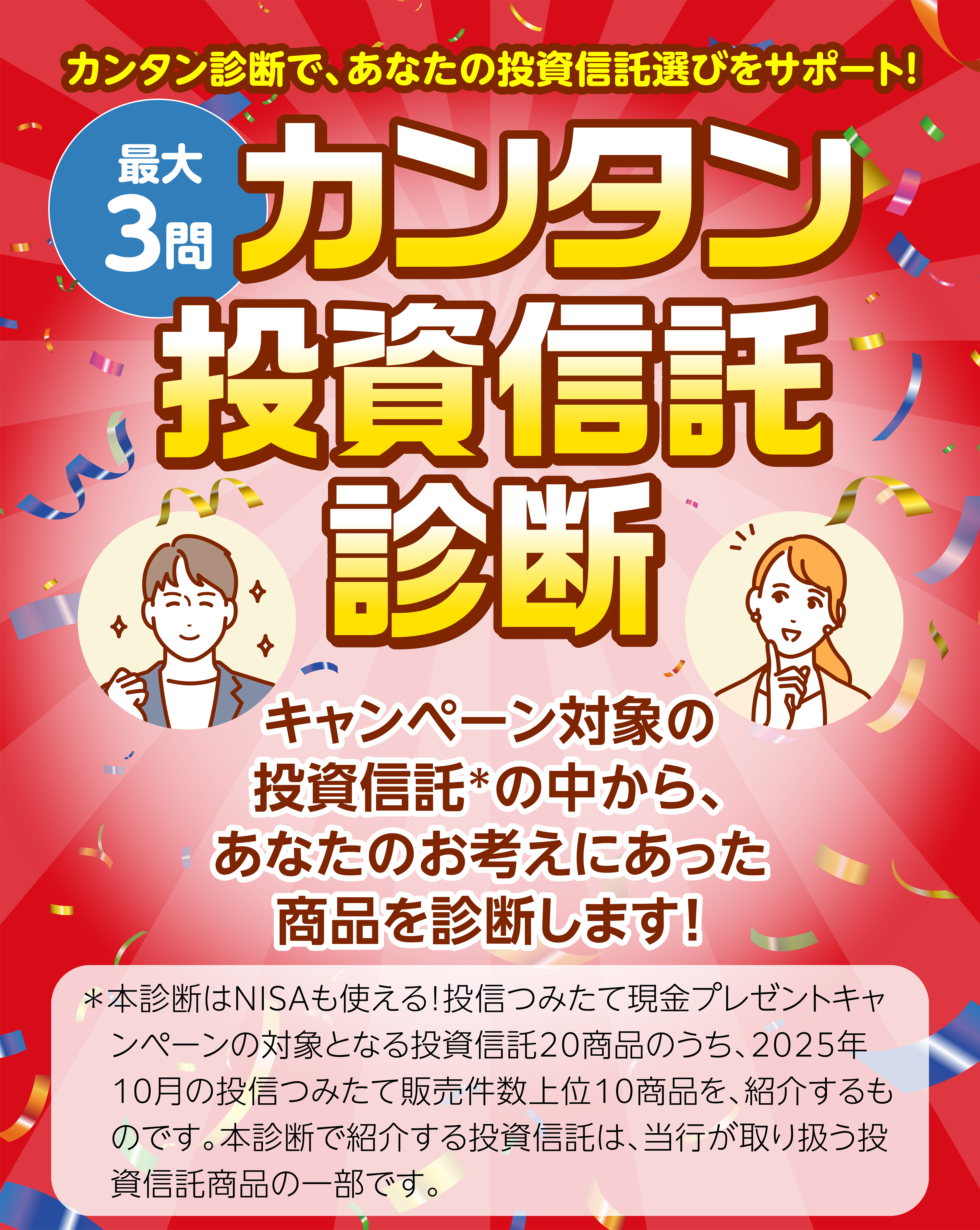 ※投信つみたて販売件数ランキングは、NISAも使える!投信つみたて現金プレゼントキャンペーンの対象となる投資信託20商品31コースにおいて、2025年10月単月の当行の投信つみたて販売件数が多い順にランキングにしたものです。参考情報の提供を目的としているものであり、個別の銘柄を推奨するものではありません。