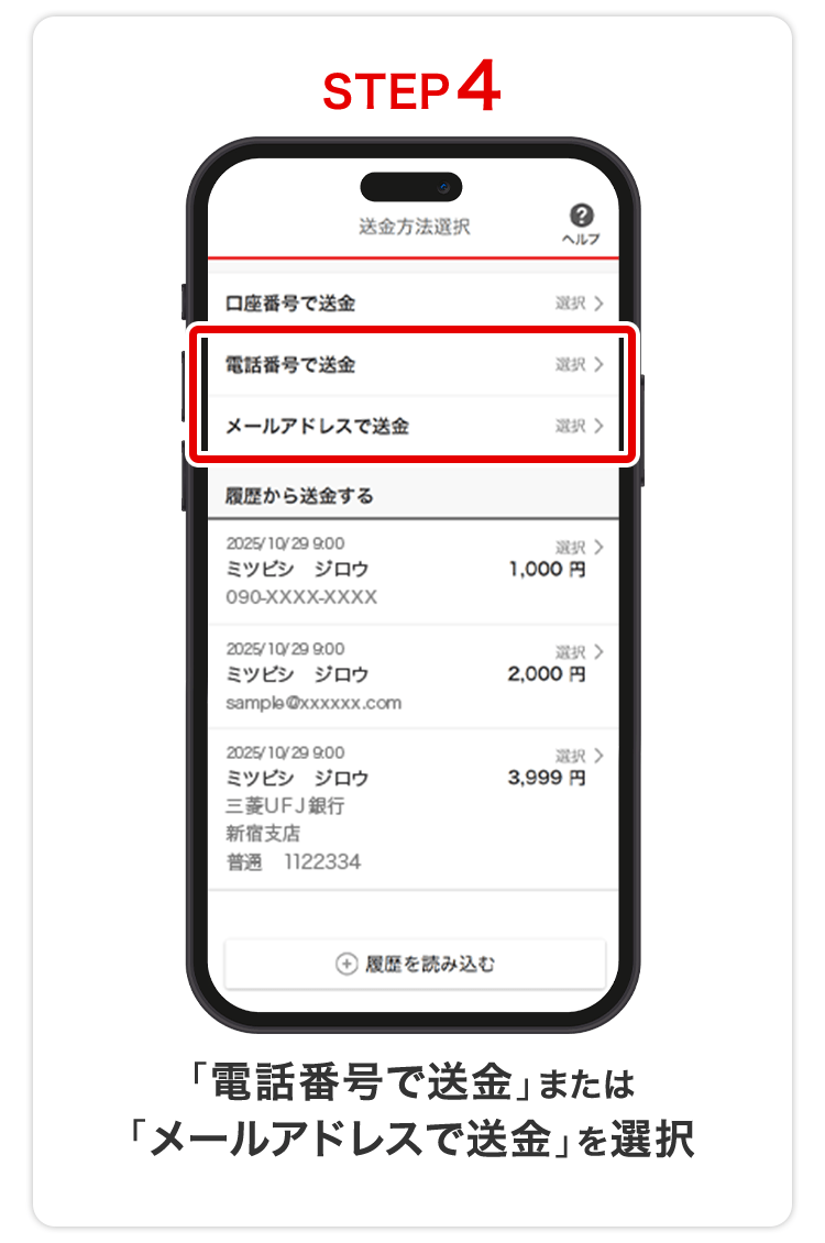 電話番号またはメールアドレスで送金する