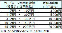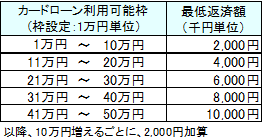 | 元利残高スライド方式 | 手数料・利息込みの一定額を毎月お支払いいただきます。月々のお支払額は、ご利用残高10万円ごとにスライドします。 |