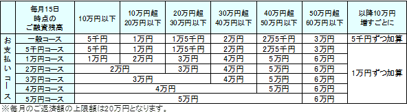 | 方式 | 締切日のご利用残高 | 10万円以下 | 10万円超20万円以下 | 20万円超30万円以下 | 30万円超40万円以下 | 40万円超50万円以下 | 50万円超60万円以下 | 60万円超10万円増すごとに |