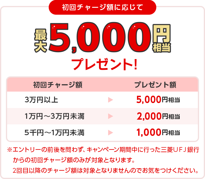 - 三菱UFJ銀行口座より初回チャージ(5千円以上のチャージで特典付与対象となります)